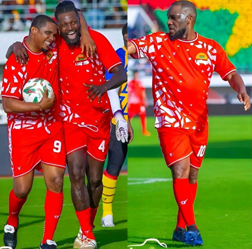Samuel Eto’o, Emanuel Adebayor y Jay Jay Okocha en el encuentro amistoso celebrado en Burkina Faso para la reinauguración del Estadio 4 de Agosto.
